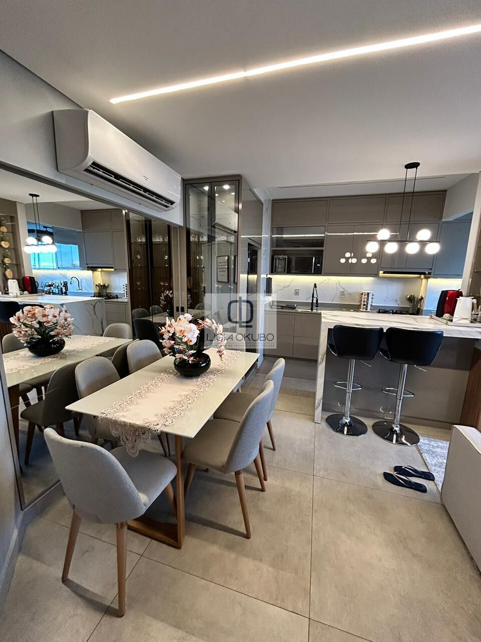 - Cozinha com armários planejados, balcão e cristaleira em vidro reflecta
